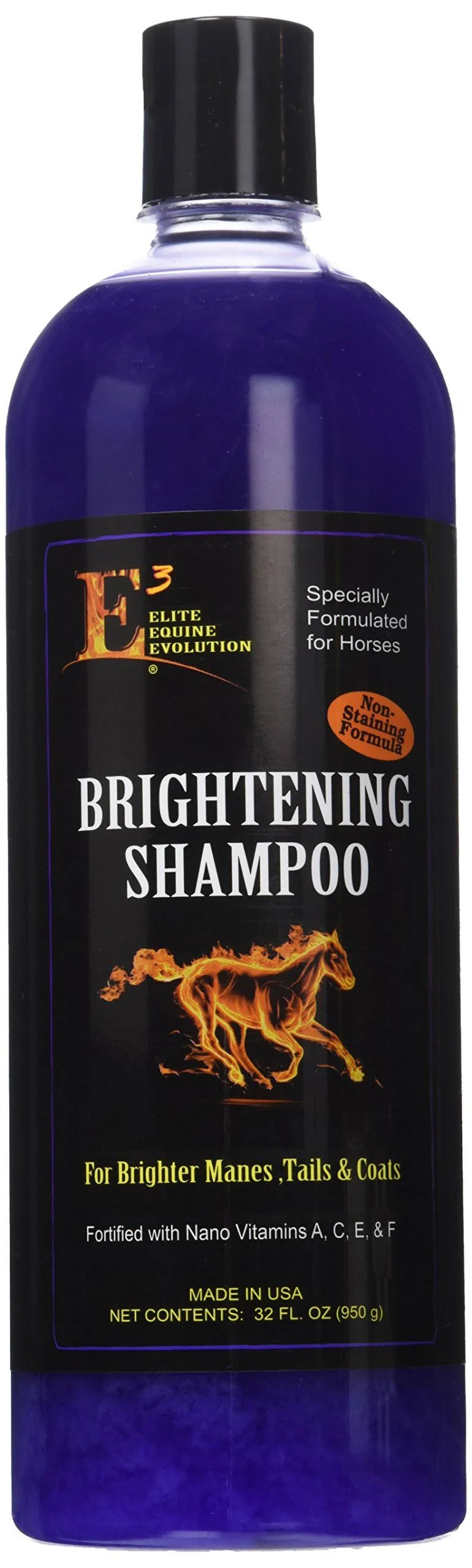E3® Brightening Shampoo was designed to brighten coats, manes, and tails, and to enhance their natural tones. E3® utilizes a nano-technology - infused formula that is designed to remove dirt, grime, green and yellow spots, to produce a show-ready sheen, without the purple residue that many whitening shampoos leave behind. Also perfect to use to whiten and brighten white, grey, palomino, cremello, perlino and other light colored hair coats, manes and tails as well. E3® is also perfect to use on darker, deeper coat colors like bay, black, chestnut, and sorrel to bring out a deep luster to the hair.