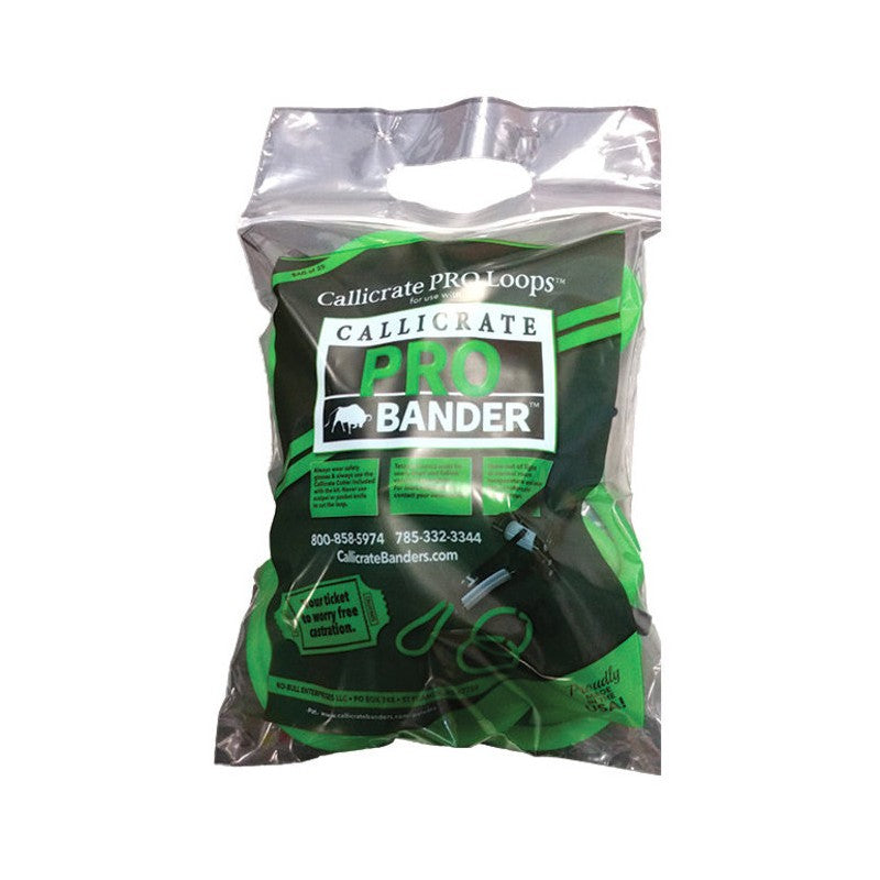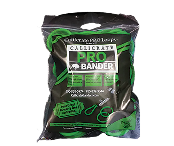 The Pro Bander design eliminates the need for a crimping rod and tension clip. Extra-strong Callicrate® loops are produced using a special solid latex formula that is over three times stronger than pre-made latex rings. Retains tension for immediate and total blocking of the blood vessels, for faster scrotal drop with less pain and swelling. Because each loop is ratcheted to the precise tightness required, each use provides a custom fit. Spring loaded indicator senses proper tightness. Scrotum should fall off in 20 to 35 days. Vaccinate with tetanus toxoid according to label directions.