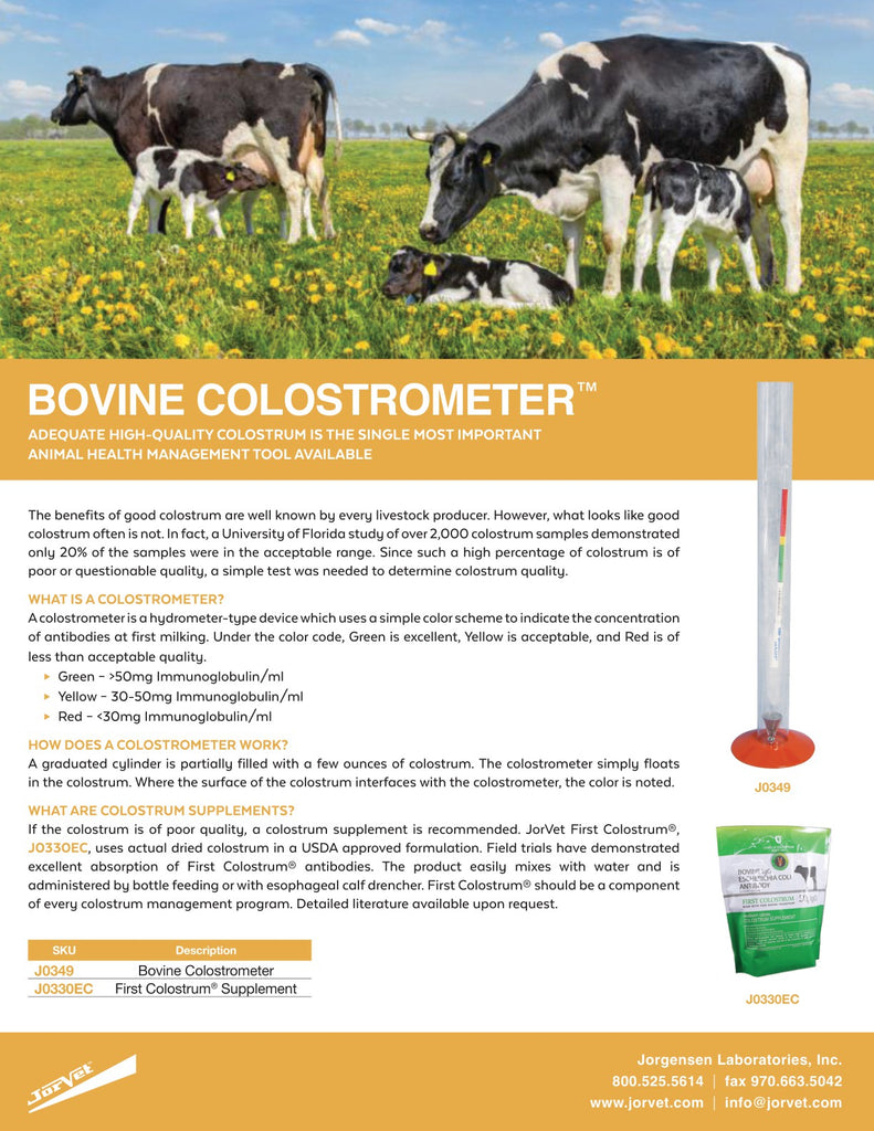 The benefits of high quality colostrum are known by every rancher.  But, what looks like good colostrum often is inadequate.  A University of Florida study tested 2,000 colostrum samples and found that only 20% of the samples contained an adequate amount of IgG for good calf health.  The JorVet Bovine Colostrumeter measures IgG content in a simple cowside test. The graduated cylinder is filled with a few ounces of Bovine colostrum.   Three levels are listed on the gauge: