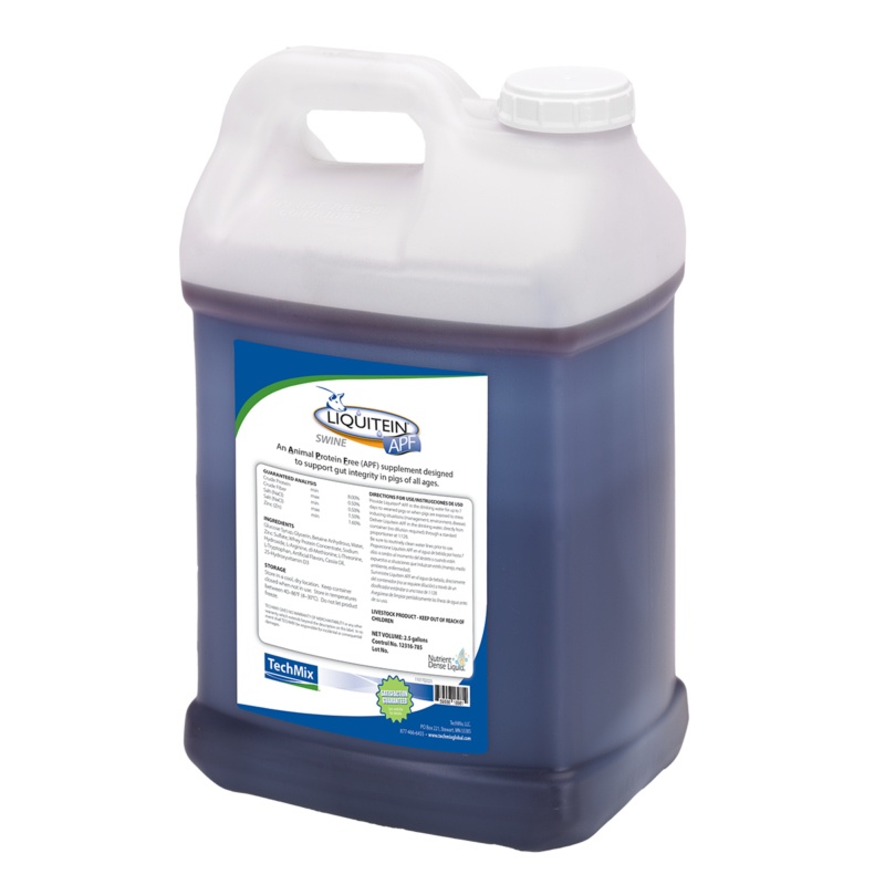 Liquitein APF® is the animal protein free, nutrient dense liquid that helps support the immune system in sick pigs facing enteric challenges. Formulated with zinc and functional amino acids and proteins, Liquitein APF® can be used for up to 7 days allowing more time for the key ingredients to help alleviate nutrient disruption, maintain hydration and provide more effective nutrient absorption.